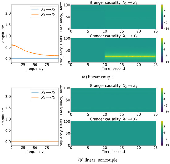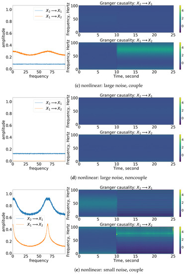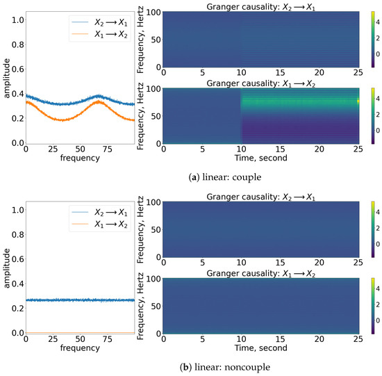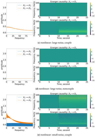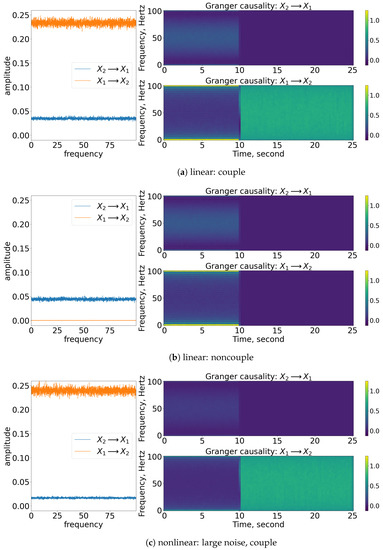 Result of the spectral and time-varying frequency of GC. Note that for each subfigure, the [left] shows the spectral (frequency domain) of GC, [blue] indicates causes , while [orange] indicates causes ; [top, right] shows the time-varying frequency of GC of to ; [bottom, right] shows the time-varying frequency of GC of to . The results shown are based on the processes in Equations (27) and (28). Refer to Figure 10 for the graphical explanation of the process. Note that the noncoupling is referring to for all the cases.