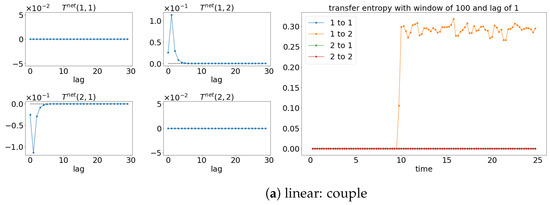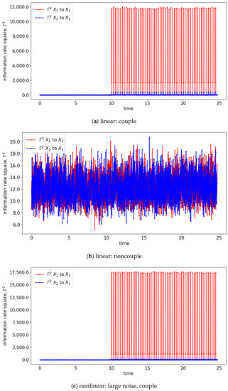 Here t is the time-step and is the physical time. The Heaviside step functions are used with suggesting the coupling occurs from the beginning of the simulation till the physical time 10 s conversely , suggesting the coupling occurs after 10 s. Similar to Section 3, 6 possible cases are simulated based on Equations (27) and (28). The simulated signals will be evaluated by GC, TE, and information rate causality.