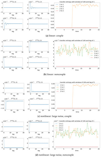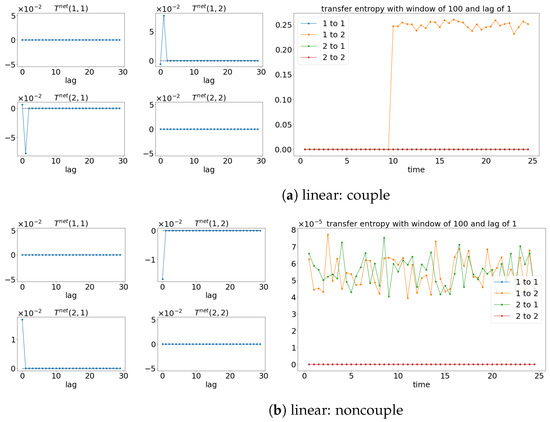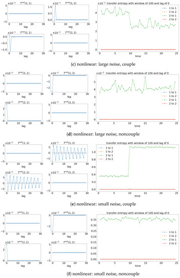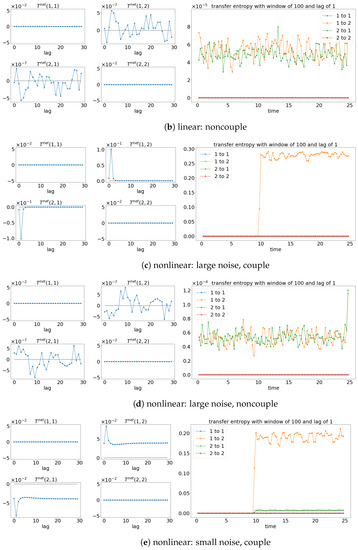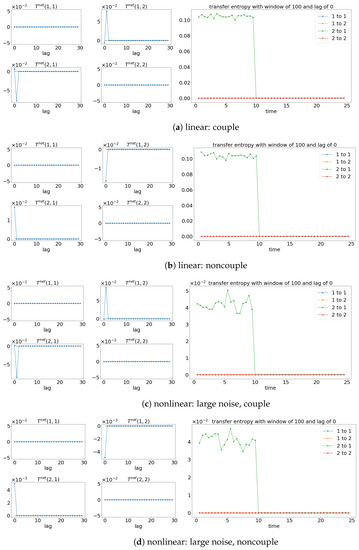 Result of the net TE and window sliding TE with the lag of 1. Note that for each subfigure, [left, ] depicts the net TE for the whole signals, while the [right] shows the window sliding TE. The results shown are based on the processes in Equations (27) and (28). Refer to Figure 10 for the graphical explanation of the process. Note that the noncoupling is referring to for all the cases.