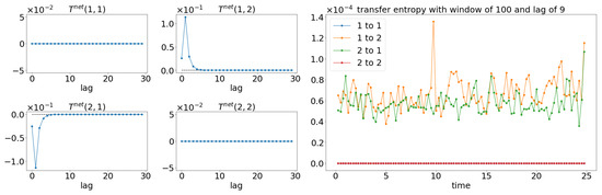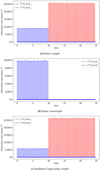 Alternatively, the information rate causality is able to show the coupling of the signals along with the lag of coupling in each window of the evaluation. As discussed, the information rate causality evaluates the causality by observing the changes in the probability distribution of one signal after it is influenced by another signal. As shown in Figure 15 and Figure 16, the information rate causality can captures the interchange of the coupling among the signals of the simulated models (Equations (27) and (28)). As discussed in TE, signal is causing at a lag of 0, and causes at a lag of 1. These lags can be observed at each window of the information rate evaluation. For instance, as shown in Figure 16, the information rate of 2 to 1 ( 2 to 1) has a spike at the beginning of the time, while the information rate of 1 to 2 ( 1 to 2) has a spike after one time step (one lag). Hence, the information rate causality is capable of showing the underlying causality of the signals.