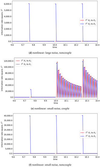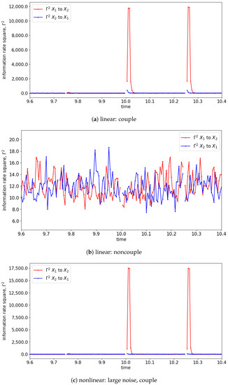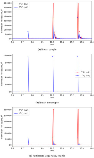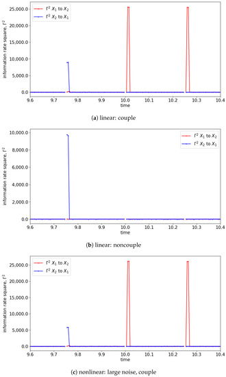 In the presence of the couplings, the changes in the distribution due to the causality among the signals can be observed via the changes in the information rate. For instance, the changes in the information rate due to the causality of to can be observed in Figure 7a,c,e (zoom-in: Figure 8a,c,e). Referring to the models, the signals are coupled with the lag difference of one ( and ), and hence the peak of the information rate is observed after one lag. From Figure 8a,c,e, the changes in the information rate prior to the coupling (at physical time 10 s) are observed as the evaluation window of [9.75 s to 10.25 s] picks up the causality of the signals from [10 s to 10.25 s]. Referring to the starting time (near 0 s) of Figure 7e,f, there is the presence of a sharp difference in information rate. This is due to the non-stationary oscillation of that causes the high disturbance of the distribution.