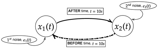 Model of the flow of information of the processes and for Equations (27) and (28). In this paper, the equations are simulated with the physical time of 25 s and sampling frequency of 200 Hertz (5000 realizations) with either large noise or small noise. Note that the process coupling with occurs before 10 s and the interchange of coupling occurs after 10 s. In the context of noncoupling, it is referring to .