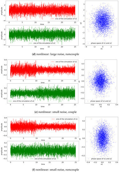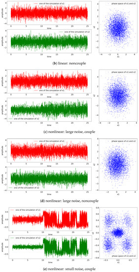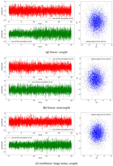 Here, t is the time steps and is the Gaussian white noise. The white noise has zero mean () with unit variance (). Additionally, we also consider the noncoupling scenario where the process solely depends on the noise ().