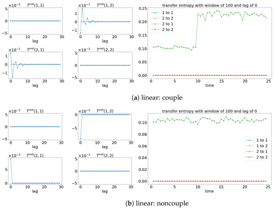 Result of the net TE and window sliding TE with the lag of 0. Note that for each subfigure, [left, ] depicts the net TE for the whole signals, while the [right] shows the window sliding TE. The results shown are based on the processes in Equations (27) and (28). Refer to Figure 10 for the graphical explanation of the process. Note that the noncoupling is referring to for all the cases.
