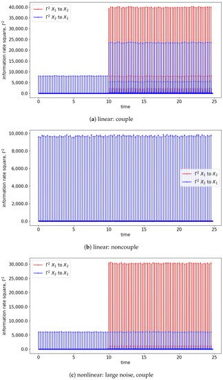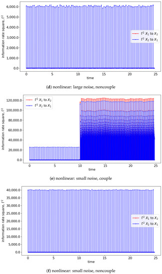 Both GC and TE detect causality by examining the increase in the predictability of the stochastic processes (measured by the inverse of entropy) when the past information is included. In comparison, information rate causality evaluates causality by quantifying the rate of change of the probability distribution of one variable conditioned on another, as noted previously. The results are shown in Figure 7 and Figure 8 where the changes of the distribution due to the causality between the processes are well-reflected via the changes in the information rate (). For the cases of noncoupling, the information rate is not changing and remains constant, which would suggest that none of the signals cause the changes to the joint distribution (refer to Figure 7b,d,f). Hence, no causality occurs between the signals. Similarly, prior to the coupling of the signals, the causality is not seen, and hence the information rate again remains constant. Notice that the information rate does not stay at zero when no causality happens, it is due to the noises/spikes of the estimated distribution, as shown in Figure S1.