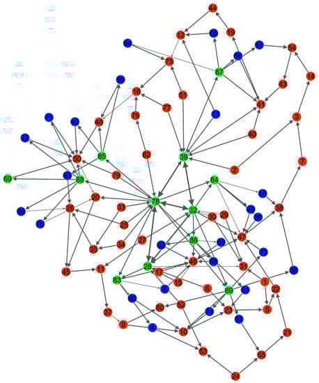 Heterogeneous warfare network (HCN). Red representing search nodes, green representing decision nodes, and blue representing influence nodes.