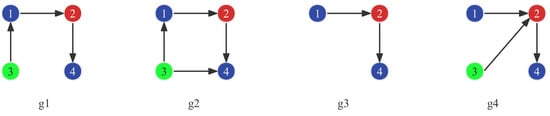 This paper proposes a link prediction method based on frequent subgraphs. Firstly, frequent subgraphs must be mined on HCN. The frequent subgraph mining algorithm can obtain all frequent subgraph patterns that meet the support threshold from the graph. gSpan [] is currently one of the most effective frequent subgraph mining algorithms in terms of mining efficiency and scalability, so it is used in experiments. Then compare the differences between different subgraphs. If only one edge (such as g1 and g2 in Figure 2) differs between two subgraphs, record the nodes and edge type. If two subgraphs differ by one node and one edge (such as g3 and g4 in Figure 2), record the missing node type and edge type. Algorithm 1 shows the specific steps. Firstly, the gSpan algorithm is used to mine frequent subgraphs that meet the threshold. As shown in Figure 2, g1, g2, g3, and g4 are frequent subgraphs in G, and g1 and g2 are isomorphic subgraphs that differ by one link, and g3 and g4 are isomorphic subgraphs that differ by one edge and one node. If their occurrence times are 8, 6, 10, and 6, respectively, then score (edge(3, 4) = 0.75, score(edge (nodeType (3), 2)) = 0.6.