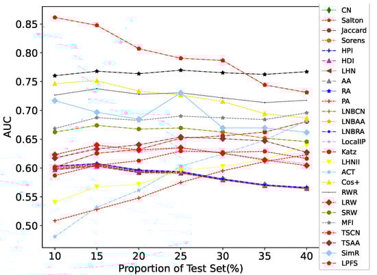 AUC value changes of each link prediction algorithm with different test set proportions. The x-axis represents the proportion of the test set, the y-axis represents the AUC, and each line represents the AUC change of an index at different proportions of the test set.