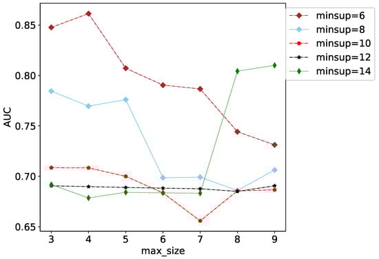 The effect of min_sup and max_size on AUC (when the training set ratio is 10%).