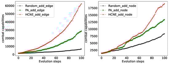 Combat network capability changes using different evolutionary methods. The x-axis represents the evolution steps (adding a new connection or a new node at each step), and the y-axis represents operational capabilities.