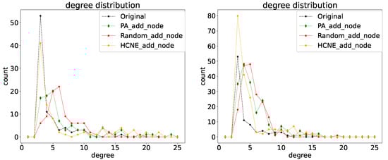 Figure 6 shows the node degree distribution of the evolved new combat network. As can be seen, the node degree of the original combat network follows the power law distribution. The new network degree distribution generated by the HCNE is more consistent with the original network degree distribution, with the largest number of nodes having a degree of 4. In addition, the number of nodes with a degree greater than 13 in the network generated by HCNE is more than in other networks, which is also in line with the characteristics of combat networks. After the number of nodes and edges in the network increases, some decision nodes need to command and communicate with more nodes, becoming large-degree nodes in the network.