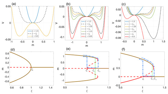 First row: Potential function vs. m for (a) Model 1, (b) Model 2, and (c) Model 3. Black lines correspond to critical values of intrinsic noise. Second row: Bifurcation and phase transition diagrams for (d) Model 1, (e) Model 2, and (f) Model 3. Red lines correspond to stable (solid line) and unstable (dashed line) equilibrium points. Green lines indicate phase transitions. Blue arrows demonstrate hysteresis loops. Specifically: (d) A supercritical pitchfork bifurcation and a second-order phase transition occur at . (e) A subcritical pitchfork and double−saddle−node bifurcation occurs at and , respectively. At , we have a first-order phase transition. (f) A transcritical and single-saddle-node bifurcation occur at and , respectively. At , we observe a first-order phase transition.