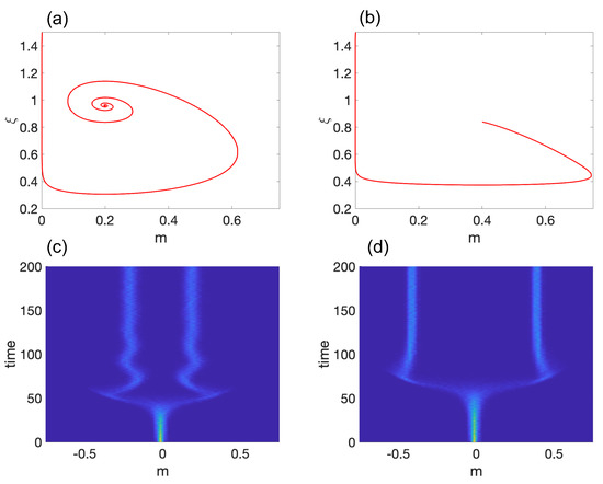 To demonstrate spontaneous symmetry-breaking events and cell fate decisions, stability analysis is complemented by representative simulations. The numerical solution of Equations (2) and (3) was obtained using the standard Euler–Maruyama method, with an integration step of . Distributions of the order parameter m were obtained over 1000 independent stochastic trajectories.