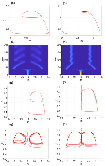 Demonstration of Hopf bifurcation in Model 2: Transition from (a) a stable limit cycle for to (b) a stable spiral for . The corresponding probability densities are displayed in (c,d), respectively, with . (e,f) depict a limit cycle with an elevated amplitude. In (f), the blue and green thick lines represent two slow modes at and , respectively. A single stochastic simulation for (e,f) is shown in (g,h), respectively, with . The parameter values used are in (a,c); in (b,d); in (e,g); and (f,h). In (a–h), .