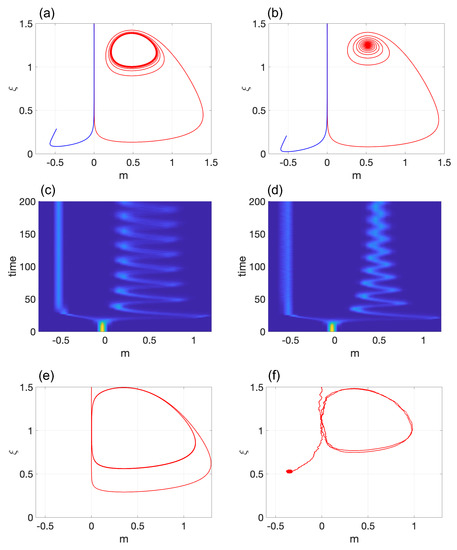 Hopf bifurcation in Model 3: Transition from (a) a stable limit cycle for to (b) a stable spiral for . The corresponding probability densities are shown in (c,d), respectively, with . Subfigure (e) shows a limit cycle with elevated amplitude. The corresponding stochastic simulations for (e) are presented in (f) with . The values of the parameters are and (a,c); in (b,d); and in (e,f). In all subfigures, .