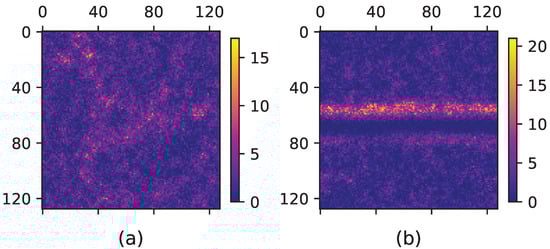 We simulated the system for and 256, , and . Additionally, R and were set to 1. The active particles were initially distributed randomly in the system with random uncorrelated movement orientations. For the systems that exhibit a hysteresis effect, we moved forward (increase ) and backward (decrease ), and for both cases, we changed by in each time step. To control statistical fluctuations, we generated three samples at each time step. We used the maximum likelihood estimation (MLE) method [] to estimate the best values for the exponent and corresponding error bars. For the data collapse analysis, we selected the graph of the largest system size as a base. We calculated the value for all other graphs by measuring the cumulative distance of the points from this base graph. The distribution of values was then used to determine the best exponents and corresponding error bars. This technique was used to better understand the relationship between different variables in the system. The density pattern of the model in the transition point is strongly dependent on the value of as shown in Figure 1.