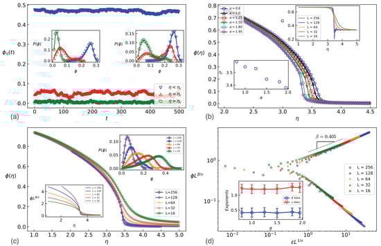 (a) The time series of for various amounts of for . Left (right) inset shows the probability distribution of for , and for (). (b) - graph for various values, showing the transition structure. Upper inset shows that Binder cumulant G in terms of for , which gives the transition point as its coincidence point. Lower inset shows the transition point in terms of . (c) - graph for various L values. The coincidence point of re-scaled is shown in the lower inset in terms of , which determines the transition point. The upper inset shows how the peak of the distribution functions runs with the system size. (d) in terms of , exhibiting a scaling behavior according to Equation (4). The inset shows the exponents in terms of .