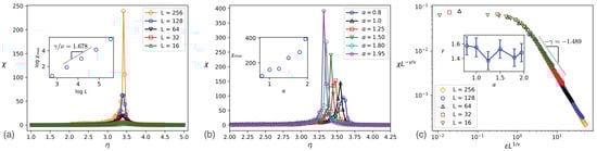 where d is the Euclidean dimension of space, which is two here. In the main part of Figure 2c and its upper inset, we show the finite size dependence of in terms of and at for , respectively. While the peak goes to the left as L increases, is L-independent exactly at as is shown in the lower inset of Figure 2c. The values of obtained through this data collapse analysis agree remarkably well with those determined via the Binder cumulant method. The results of the data collapse analysis presented in Figure 2d confirm that our model obeys finite size scaling relations for sufficiently small values in accordance with second-order phase transitions. Note that the exponents and are robust against changes in , and also of the fitting increases as increases (the worse fitting is for in our set), showing that the scaling hypothesis works for sufficiently small values, and the finite-size scaling Equation (4) is not appropriate for large values. One may use the theory of finite-size scaling for first-order transitions [] for those cases, which is outside the scope of the present study. is reported in Figure 3a, exhibiting a pronounced peak at the transition point. (the amount of at its peak) also scales with L by the exponent . Figure 3b displays the dependence of and , indicating that an increase in corresponds to an increase in fluctuations of , which is the reason why increasing favors the disordered phase. A data collapse according to Equation (4) for is presented in Figure 3c, giving for all values. The exponent is found to be in the interval [1.4–1.6] for all values, which agrees with the hyperscaling relation Equation (5).