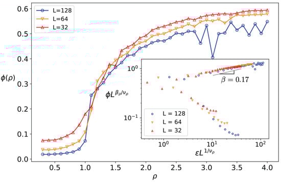 The behavior of the system in terms of density is crucial in understanding the emergent collective behaviors of self-propelled particles. We found evidence regarding the density-driven order–disorder transition for super-diffusive active particles by inspecting the properties of in terms of . We first considered the transition in terms of for low density regime (). In this case, similar properties, such as high density limit , were observed, shown in Appendix A (Figure A2). We also found also a density-driven order–disorder transition, which is depicted in Figure 4, showing this transition in terms of for and . The critical density in this case was found to be , and the exponents of the transition were and . Again, the transition showed similarities with the second-order phase transition paradigm (such as the finite size scaling, based on which we extracted the exponents using the data collapse analysis) but was not completely fitted to it.