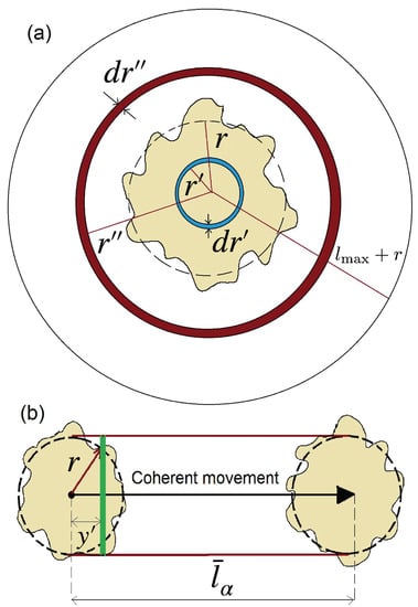 Schematic representation of the mean field method. (a) A static swarmed cluster (the yellow area shows), where r is its average radius, and the red and blue rings indicate the number of particles entering and leaving the cluster, respectively. (b) The coherent movement of the swarmed cluster in the preferred direction . The green bar moves from to running over the area inside the swarmed cluster. The active particles with Levy flights in the range remain inside the swarmed cluster if the average radius r remains approximately unchanged during the process. The number of such particles is , where N is the number of particles inside the cluster in the previous step.