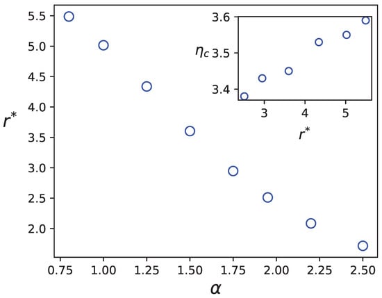 n (defined in Equation (A4)) in terms of r for for various values. has been defined as the point with bold circles with the same color as the main graph ( decreases as increases).