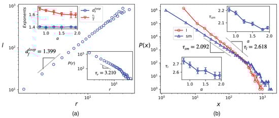 (a) in terms of for , the slope of which is . Lower inset: the distribution of the gyration radius r for . Top inset: and in terms of . (b) The distribution of the loop length () and submass (). Top (Down) inset shows () in terms of .
