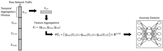 In our work, we aggregate the raw time-series network traffic data with a sliding window. This approach is described in previous works [11,39] as a preprocessing step called temporal aggregation (we use this term), and as a pre-filtering phase. Temporal aggregation is used to cope with the high volume and velocity of the captured data from the network sensors. This approach extracts high-level information from the raw data features, such as basic statistical measures, utilizing aggregations with a fixed-size sliding window technique that takes advantage of the natural temporal characteristics of data. These extracted statistics, obtained by the aggregations, are then passed to an anomaly detector.