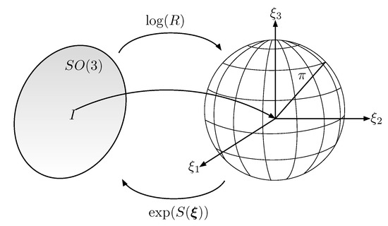 Alternatively to rotation matrices, the rigid body’s attitude can be described by the vector quantity where is the axis of rotation and is the rotation angle. The vector is called the exponentialcoordinates of R and represents a minimal parametrization of the rigid body’s attitude [27]. The rotation matrix R and the exponential coordinates are related by the exponential map