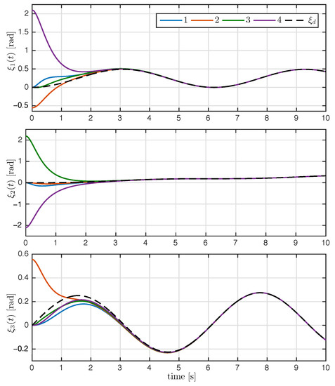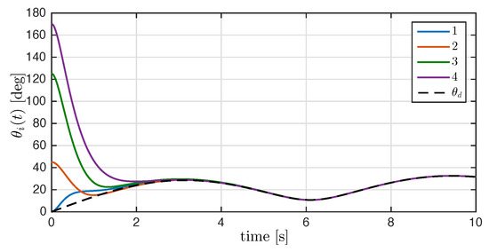 for all . The time evolution of the angle of rotation of each rigid body is depicted in Figure 6. After the transient response, the angles of rotation converge to the desired rotation angle .