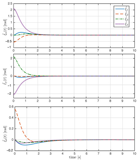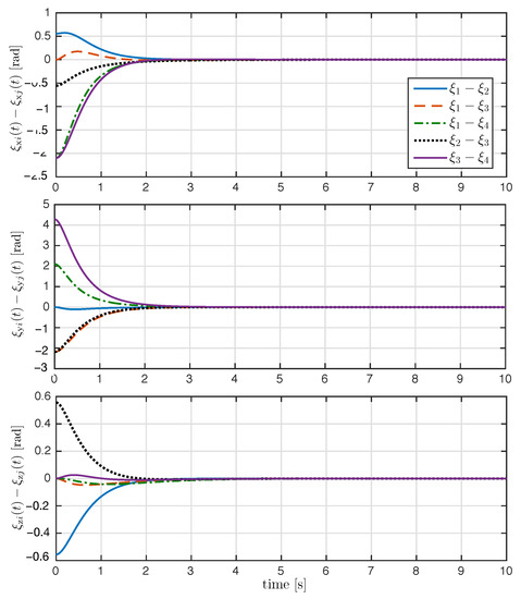 We recall that are the angle/axis of rotation. The initial attitude as a function of the angle/axis parameters is described in Table 1. The four rigid bodies start at the rest position; this implies that the initial angular velocity is zero, i.e., [rad/s]. In the simulation, the control gains were selected as