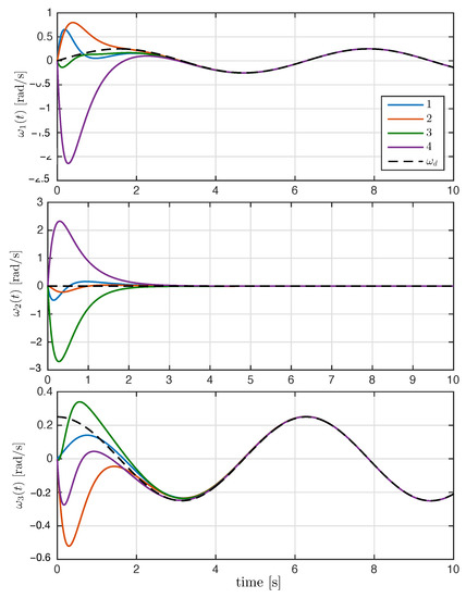 Time evolution of rigid bodies’ angular velocity with , and the dashed line denotes the desired angular velocity .