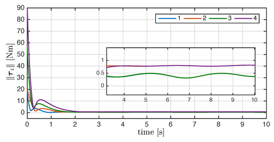 On the other hand, Figure 7 shows the components of the angular velocities for each agent, which converge exponentially to the desired angular velocity, meaning that the attitude synchronization objective is reached. Finally, the magnitude of the control input torque generated by the synchronization control law is shown in Figure 8.