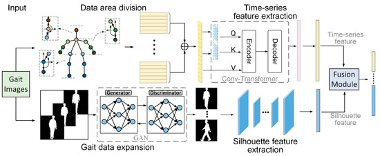The above analysis suggests that to achieve more accurate and reliable gait recognition, it is most important to obtain gait data with complete time-series information and a sufficient amount of data. In order to achieve gait recognition under shorter input duration, a two-branch fusion gait recognition algorithm combining time-series data and silhouette information is proposed in this paper. The time-series information is modeled using a region coding network based on Transformer [24]. The expansion and integration of the silhouette data is implemented using a generative adversarial network with an added attention mechanism. In order to make full use of the feature information of the two-branch network, a feature fusion module is designed in this paper for the two dimensions of time series and contour, which differ significantly.
