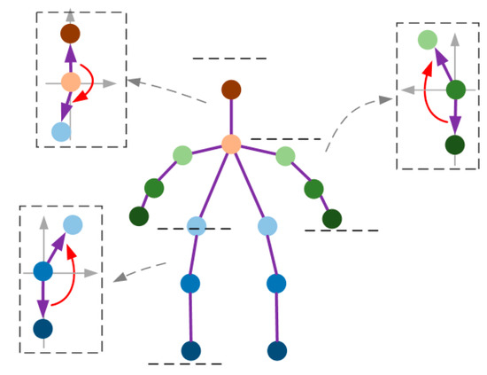 We focus on three human characteristics in one area, namely joint vector, limb length and joint angle. During walking, the joint vector v, limb length l, and joint angle calculated by Equations (2)–(4) will also change as the position of each joint changes. Although the vectors, angles, and lengths are calculated from the coordinate data of the joint points, we still hope that we can find the patterns of gait motion from the sequence data of different aspects. Where (x, y) are the pixel coordinates of the joint points,