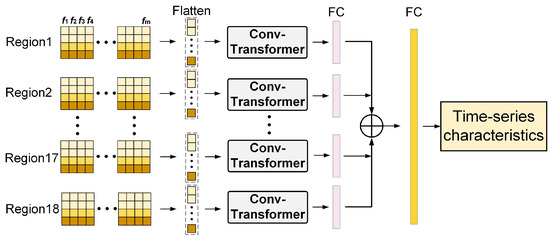 The time-series feature vectors output by the self-attention module are concatenated into one region of time-series data features. The time-series features of multiple regions are finally concatenated and expanded again.