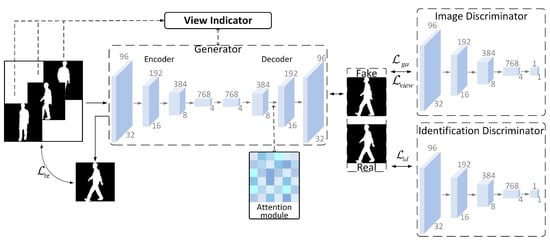 The fake images are generated through a generator and discriminator confrontation consisting of a convolutional neural network. The generator is used to process the input image data x and view information v, learn the distribution of the original data at a specific view, and generate the fake image y. To improve the quality of image generation, this paper adds a self-attention computation module to the generator network. The discriminator is used to estimate the probability that the corresponding input is real or fake. In the adversarial process, the goal of the generator is to map, as much as possible, the same distribution of real image data to send to the image discriminator for estimation. It is very important to keep the identity information during the cross view gait image generation process. Therefore, we propose an identity discriminator based on GaitGAN to distinguish the generated image identity information by training on identity loss. In order to make the images reconstructed by the generative adversarial network match the real images as closely as possible, a smooth L1 loss function [29] is introduced in this paper for maintaining the usability of the generated images. During the overall training of the network, the minimization and maximization of the adversarial loss functions are relied upon to constrain the generators and discriminators to