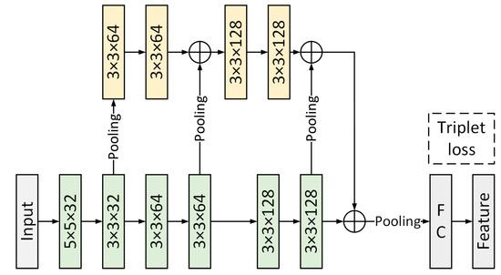 In this paper, the gait silhouette feature extraction is based on the GaitSet convolutional neural network structure, as shown in Figure 7. The input of the network is the expanded gait silhouette dataset. The feature extraction backbone consists of 6 convolutional layers. The branches of the network are used to fuse the time-series features of the silhouette images. The two features obtained from the backbone and branches are concatenated and mapped through fully connected layers to obtain the gait contour features. In order to fully use this network for feature extraction, the input image is cut, scaled, and cropped to obtain a gait contour map of size 64 × 64.