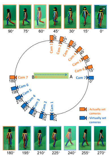 The OU-MVLP dataset is a large multi-view pedestrian dataset created by Osaka University, Japan. The dataset contains 10,307 walkers, including 5114 males and 5193 females, distributed in different age groups. The dataset contains a total of 14 views with 15° intervals between the views, and OUMVLP-Pose is built on top of OUMVLP. The builder of the dataset used pre-trained models from OpenPose [37] and AlphaPose [38] to extract the human skeletal point location information from the RGB images of OUMVLP. Figure 8 shows the schematic diagram of the OUMVLP-Pose dataset acquisition provided by the OU-ISIR biometric database website.
