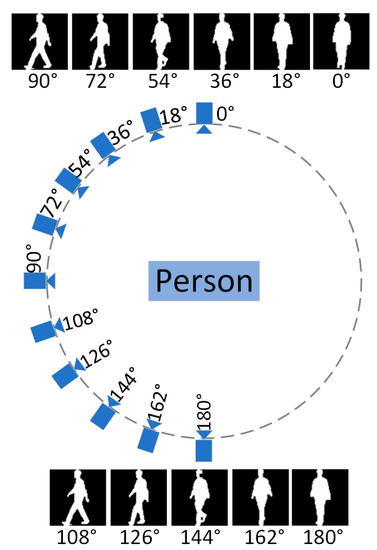 The CASIA-B dataset contains a total of 124 walkers and three walking states, including normal walking (NM) with six sequences per person, walking with a bag (BG) with two sequences per person, and walking while wearing a coat (CL), with two sequences per person. Each sequence for each pedestrian has 11 observed viewing angles with an angle range (0°, 18°, 36°, …, 180°) at 18° intervals. Figure 9 shows a schematic of the gait silhouette acquisition environment in the CASIA-B dataset.