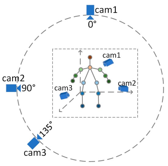 In order to evaluate the two-branch fusion model presented in the previous chapter, gait data were collected in a realistic scenario. The acquisition was performed by setting up a multi-view camera in a laboratory environment with nine subjects walking at a uniform speed on a walking machine. In order to simulate the process of real-life surveillance cameras on people, the camera views were located at 0°, 90°, and 135° of the subject’s body (0° directly in front of the body and increasing counterclockwise). Figure 10 shows the schematic diagram of the acquisition environment for the test data.