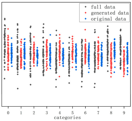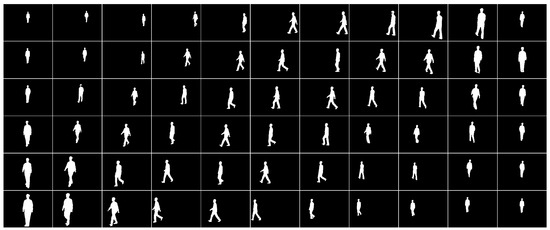 Figure 14 shows the gait data of 10 people randomly selected from the original dataset, the generated dataset, and the fused dataset, respectively. From Figure 14, it can be seen that the distribution of gait silhouette data generated using the algorithm of this paper has a similar pattern to that of the same kind in the dataset and achieves the purpose of expanding the gait dataset in terms of quantity.