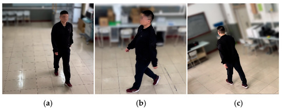 First was the quantitative evaluation part. By setting up cameras under three views of 0°, 90°, and 135° in an indoor environment, the data of keypoints of the human body were collected using OpenPose and the data under the three views was averaged. The silhouette extraction was performed by background subtraction. Figure 15 shows our gait data collection in different views. In accordance with our laboratory regulations and data privacy instructions, we defocused the background of the images and mosaicked the volunteers’ faces. In addition, we visualized the extracted feature data for characterizing the relevant motion patterns. This is shown in Figure 16.