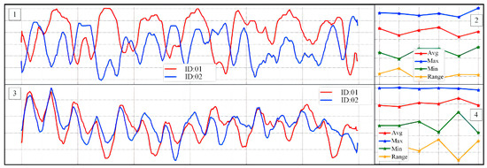 In Figure 16, region 1 shows the curve obtained after min-max normalization of the fused feature vectors, and the data in region 2 are the first five larger and the last five smaller data extracted from region 1. Region 3 is the curve obtained after Z-score normalization of the fused feature vectors, and the data in region 4 are the first five larger and the last five smaller data extracted from region 3. From Figure 16, we can see that different walkers show different movement patterns in their bodies while walking. According to these patterns, we can effectively identify the walkers in the video.