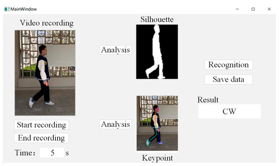Finally, there is the qualitative evaluation part. We used a short-time video taken for recognition effect testing, and the duration of the pedestrian walking video is 5 s. In order to systematize the recognition process, we designed the upper computer interface of the gait recognition system using PyQt5, as shown in Figure 17.