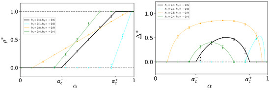 Bifurcation diagrams for the bipopulated voter model with preferences on the complete network. On the left, the total density of up spin is taken as order parameter; on the right, the polarization is shown. The solid black line indicates the stable fixed point, while the dashed gray lines indicate the unstable ones, for the choice of the preferences’ intensities . The other solid colored lines locate just the coexistence stable fixed point for other choices of the intensities, as indicated in the legend. The points and their bars are, respectively, the average and the confidence interval of the order parameters calculated over 30 independent simulations of a system with 1000 agents, and they are reported in order to also test the validity of the mean-field treatment for relatively small system sizes.