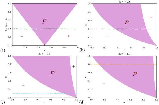 Phase diagrams for the complete network. The polarized area is colored in light purple and indicated with P, and in white are + and − consensus. (a) shows the mean-field phases in the plane, for equal and opposite preferences’ intensities . The dark purple dot represents the regime in which [28] have investigated finite-size effects. (b–d) report the phases in the plane, once fixed , respectively, to . Each of the colored horizontal lines present in some of the plots represents the choice of the biases as in Figure 1 (the colors correspond). They are reported in order to show how the lines intersect the different phases.