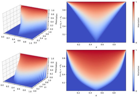 VMP on modular networks with equally strong opposite preferences, plane. The mean-field predictions are shown, i.e., the stable fixed point of the system (8), for two choices of connectivities of the modular network. Upper plots: case , corresponding to the fully connected topology (subplot (a) in Figure 2). Lower plots: case , , i.e., still symmetric probabilities but segregated communities. The polarization increases and the polarization area widens; nevertheless, the general qualitative behavior is preserved.