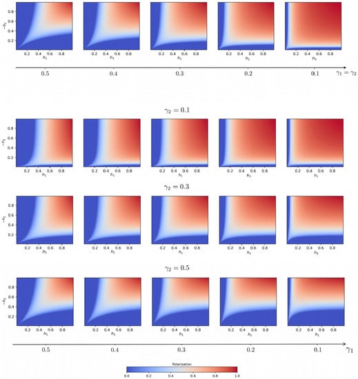 Being the average fractions of external connections over the total number of connections of the agents in classes 1 and 2, can be intended as the average open-mindedness of the individuals of, respectively, the first and second communities. Because in an epistemic bubble the agents overrepresent (i.e., are more linked to) their belonging community, we expect and . The more far are from these upper extremes, the more the individuals of the corresponding population have unbalanced sources of information, i.e., are trapped in the bubble. If the individuals have on average more connections within their belonging community rather than toward the other, then . Figure 4 shows the stationary polarization in the plane, for different choices of the open-mindedness parameters , by numerically calculating the fixed points of the mean-field system (10) and determining their stability.