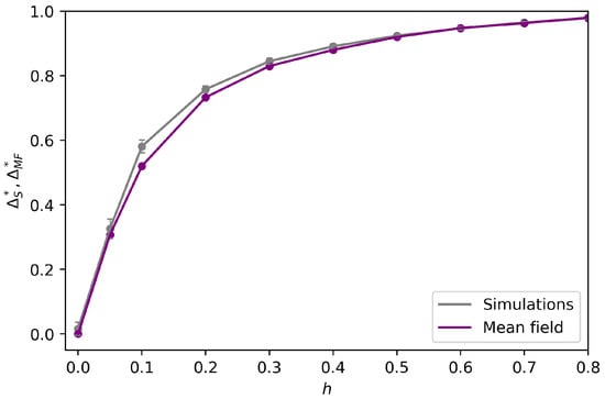 Mean-field predictions and simulations of the model on the 2004 Blogosphere. We compare the mean-field predictions (purple line) and the numerical simulations (gray line) of the asymptotic polarization on the 2004 Political Blogosphere, restricting to equally strong biases , for various h.