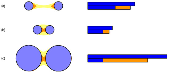 Three pairs of clusters at three increasing filtration parameters (no necks, communities shown in blue), (necks shown in orange), and (necks shown in yellow). For each pair of clusters, we also show the standard TDA barcode (blue bars, from to the value of when the clusters become connected), and an extended barcode shown in orange where the original clusters remain distinguishable. In (a), the two small clusters remain distinguishable over a large range of filtration parameters. This is to be contrasted against (b), where the two clusters are the same sizes as those in (a), but are closer to each other. They are therefore distinguishable only over a small range of filtration parameters. Finally, in (c), we have two large clusters whose separation is the same as that in (b). However, because of their sizes, the two large clusters are distinguishable over a much larger range of filtration parameters.